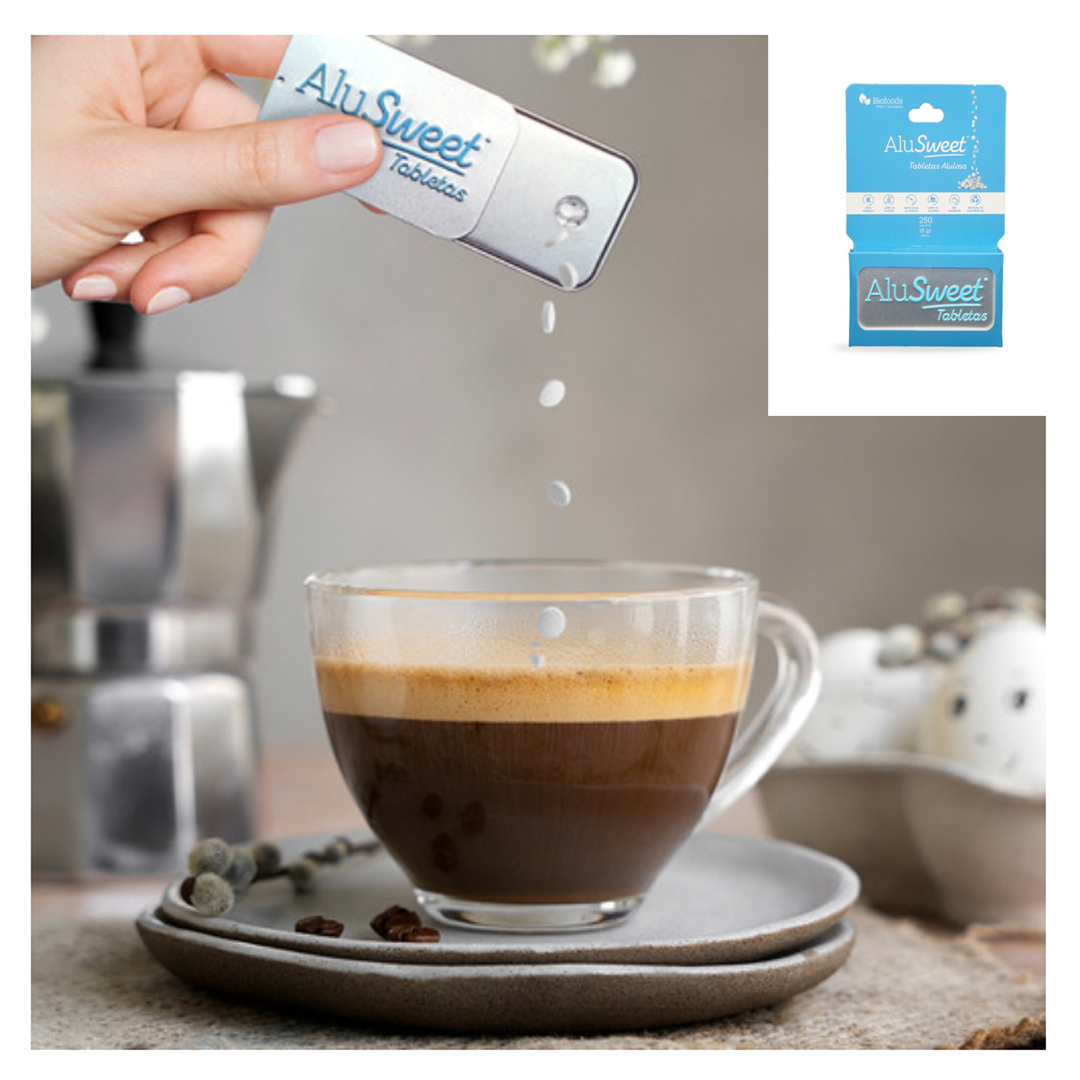 AluSweet es una cajita portátil de alulosa en pastillas para endulzar tus bebidas frías o calientes.