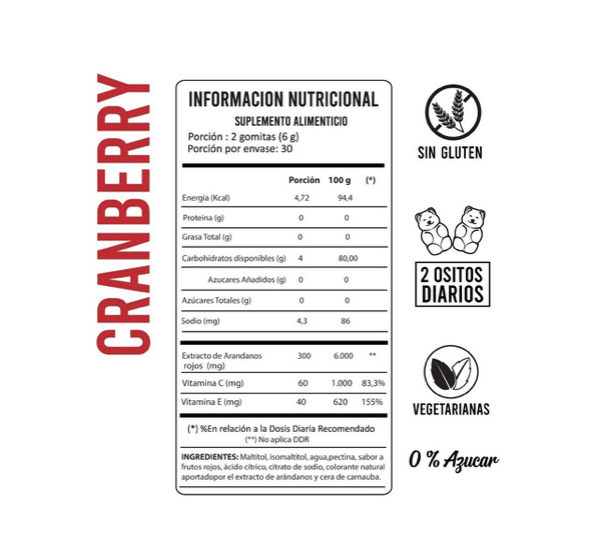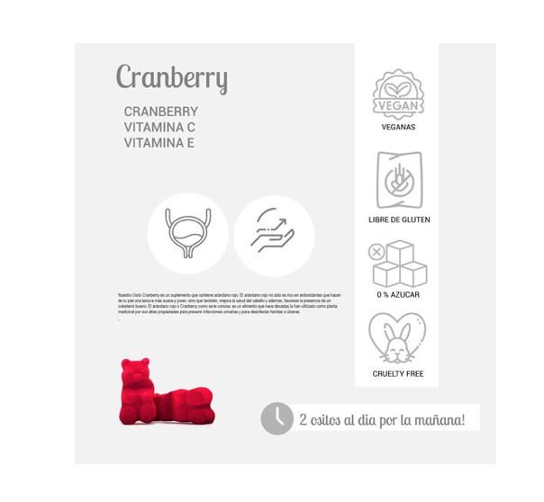 Osito Cranberry es un suplemento que contiene arándano rojo. El arándano rojo no sólo es rico en antioxidantes que hacen de tu piel una textura más suave y joven, sino que también, mejora la salud del cabello y además, favorece la presencia de un colesterol bueno. El arándano rojo o Cranberry como se le conoce, es un alimento que hace décadas la han utilizado como planta medicinal por sus altas propiedades para prevenir infecciones urinarias y para desinfectar heridas o úlceras.