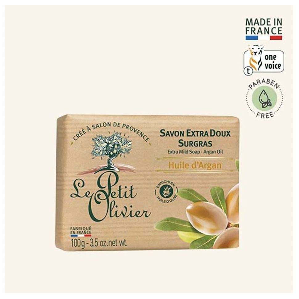 jabón extra suave enriquecido con aceite de Argán, de Le Petit Olivier está formulada en base a aceites vegetales. Enriquecida con aceite de oliva y extractos naturales limpia suavemente la piel.