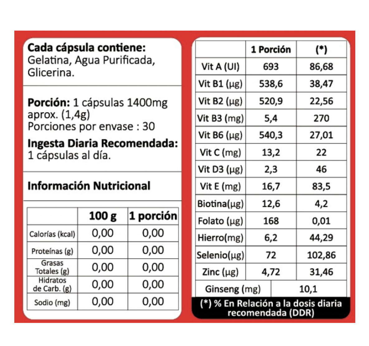 693ui Vit. A – Vit. B1 – Vit. B2 – 5,4 Vit. B3 – Vit. B6 – 13,2mg Vit. C – Vit. D3 – 16,7mg Vit. E – Biotina – Folato – 6,2mg Hierro – Selenio – Zinc + 10mg Ginseng Panax.