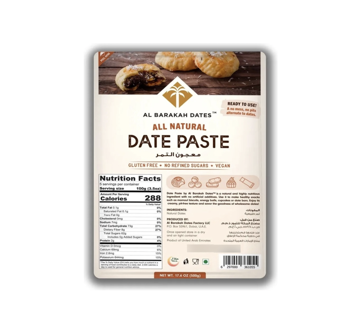 Formato: Bandeja al vacío contiene 500gramos de pasta de dátiles vegana, sin gluten , sin azúcar añadida. ideal postres y pastelería.